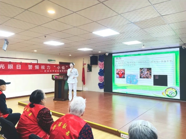 接著,眼科楊月瑩護(hù)士通過(guò)多媒體課件針對(duì)青光眼的預(yù)防及日常生活護(hù)理進(jìn)行科普講座。她用通俗易懂的語(yǔ)言,生動(dòng)形象的從心理、作息時(shí)間、飲食、生活習(xí)慣、用眼衛(wèi)生等方面講授了青光眼的預(yù)防和護(hù)理,并且?guī)ьI(lǐng)并指導(dǎo)老人做眼部按摩操。