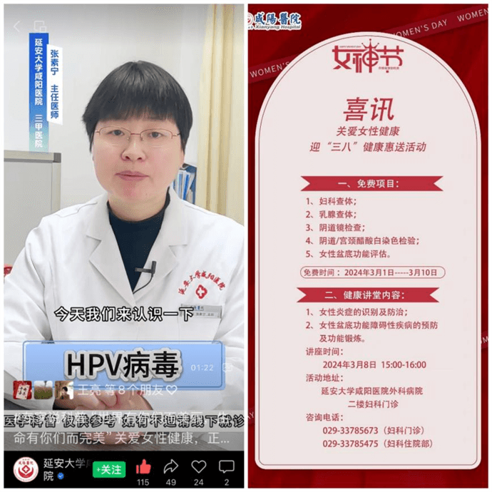 婦科張素寧副主任通過媒體進(jìn)行女性人乳頭瘤病毒防治的科普小視頻知識講座,從感染途徑、易感人群及防治措施等多方面講解女性人乳頭瘤病毒感染的相關(guān)知識;同時,在公眾號平臺發(fā)布活動通知,積極鼓勵廣大女性朋友參加現(xiàn)場科普講座,并做好相關(guān)疾病的早期篩查工作。