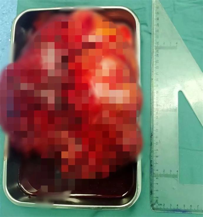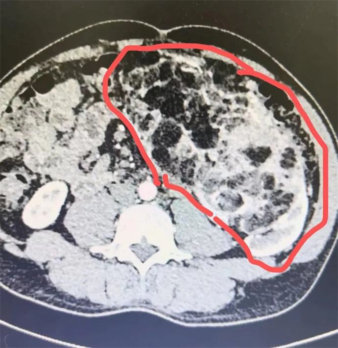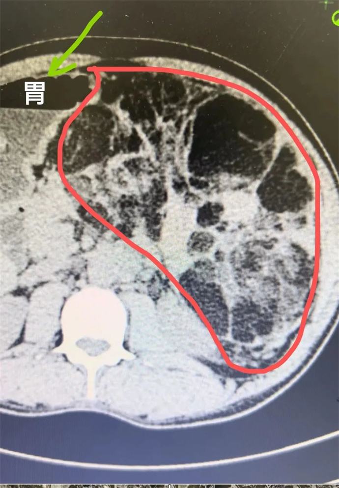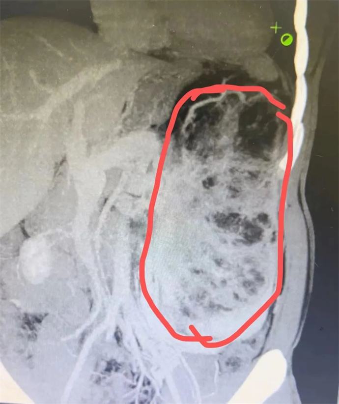近日,我院泌尿外科會診一位四十多歲男性患者時發(fā)現(xiàn),該患者腹部有一巨大腫瘤,直徑近30cm,已將該患者胃、胰腺、脾臟及部分腸管擠壓移位,且腫瘤內(nèi)可見大量動靜脈畸形,存在極大的出血風險,一旦出血將危及患者生命,客觀告知患者及家屬相關病情后,患者及家屬憂心忡忡,基本的日?;顒佣夹挠形窇?,充分溝通后,轉(zhuǎn)入泌尿外科,擬行手術治療。