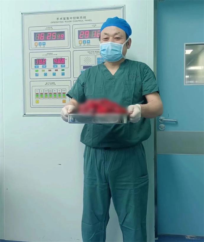強永春主任帶領泌尿外科團隊積極協(xié)調(diào),提前預約腫瘤介入王忠主任,于術前行介入栓塞,減少術中出血風險;同時聯(lián)系輸血科提前術中備血;因腫瘤已侵及腎臟大部及腎臟血管,無法保留腎單位行腎部分切除,故先側(cè)臥位行后腹腔鏡下微創(chuàng)手術,游離并處理腎臟血管,確保切除時安全,再仰臥位行錯構瘤及腎臟切除;充分準備后,手術按預定方案如期進行,歷時6小時,成功拆除“定時炸彈”。目前患者已出院恢復了日常工作。