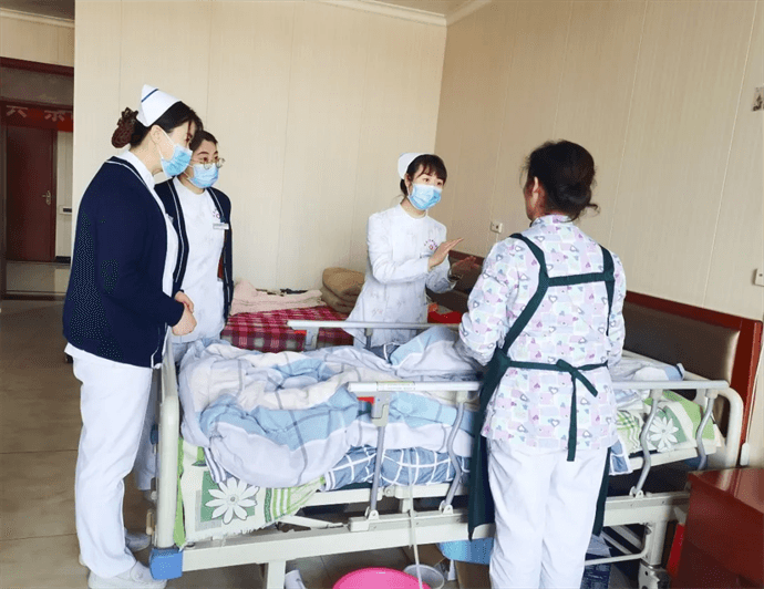 最后,康復(fù)醫(yī)學(xué)科劉敏護士長帶領(lǐng)專業(yè)組成員進入公寓內(nèi)部,對部分失能老人進行護理查房,現(xiàn)場指導(dǎo)養(yǎng)老院的工作人員照護方式。劉敏護士長、徐莉護士長對一例股骨轉(zhuǎn)子間骨折長期臥床的老人進行了康復(fù)鍛煉、營養(yǎng)支持、并發(fā)癥預(yù)防方面的指導(dǎo);劉文靜護士長、張雨護師對兩例帕金森患者的服藥、功能訓(xùn)練等進行指導(dǎo);趙小飛護士長、劉昱宏主管護師查看了一例壓力性損傷患者及一例失禁性皮炎患者,對傷口處理、失禁管理進行指導(dǎo)。