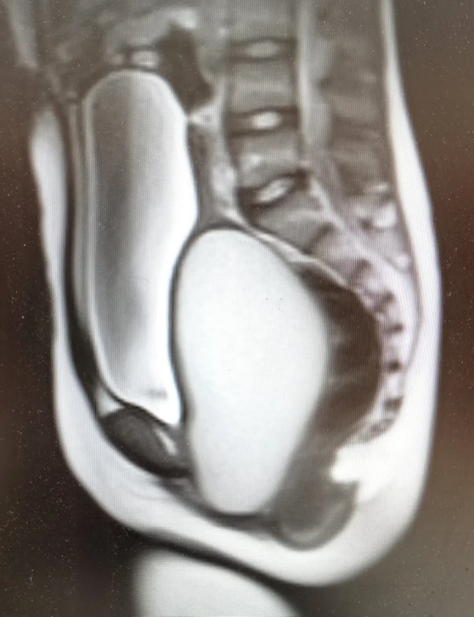 12歲花季少女出現(xiàn)周期性下腹痛,在其父母帶領(lǐng)下先后就診咸陽市兩家醫(yī)院,最終,她們選擇了延安大學(xué)咸陽醫(yī)院婦科。就診當(dāng)日,趙倩蘭主管醫(yī)生詳細(xì)追問病史,患者自訴已間斷性下腹痛3月余,本次腹痛較前明顯加重,腹痛難忍。入院后醫(yī)生立即為其安排了婦科彩超及盆腔磁共振,發(fā)現(xiàn)該患者宮腔、宮頸及陰道上段充滿大量積血,積液壓迫膀胱及直腸,導(dǎo)致排便、排尿障礙。張素寧主任為其查體后發(fā)現(xiàn),該患兒陰道竟無開口,導(dǎo)致經(jīng)血無法排出,閉鎖處無隆起,無青紫,排除處女膜閉鎖,直腸檢查發(fā)現(xiàn)陰道上端有一包塊凸向直腸,包塊下緣距離肛門口約4-5cm,結(jié)合查體及相關(guān)輔助檢查,考慮該患者為陰道閉鎖,值得慶幸的是該患者其他系統(tǒng)暫未發(fā)現(xiàn)畸形。