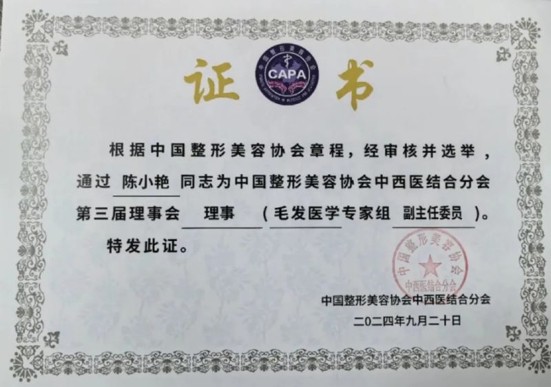 我院皮膚科主任陳小艷教授當選為中國整形美容協(xié)會中西醫(yī)結合分會第三屆理事會理事(毛發(fā)醫(yī)學專家組副主任委員)