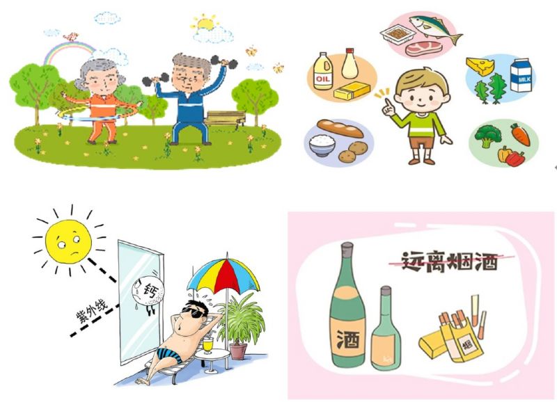 2、合理飲食:①增加鈣的攝入:指南建議50歲以上的人,每天補充1000mg的元素鈣。而日常生活中通過正常飲食能夠攝入約400mg左右元素鈣,所以每天還需經(jīng)過藥物補充600mg。但是實際上,補鈣的劑量非常個體化,跟飲食習慣關(guān)系密切。日常含鈣高的食物主要包括:奶制品、深綠葉蔬菜、豆制品等。100ml牛奶含鈣量100~120mg,如對牛奶中的乳糖不耐受(腹脹、拉肚子),可選擇無乳糖牛奶或者酸奶,奶酪??紤]到食物的豐富多樣性,建議每天至少喝300ml牛奶,外加深綠葉蔬菜300~500g,豆制品等,以滿足機體需要。②補充維生素:骨的代謝與多種維生素相關(guān),尤其是維生素D與維生素K。維生素D主要靠日照產(chǎn)生,也存在于魚、肝、蛋黃、奶制品等食物中;維生素 K在綠葉蔬菜尤其是深色的蔬菜中含量最高。