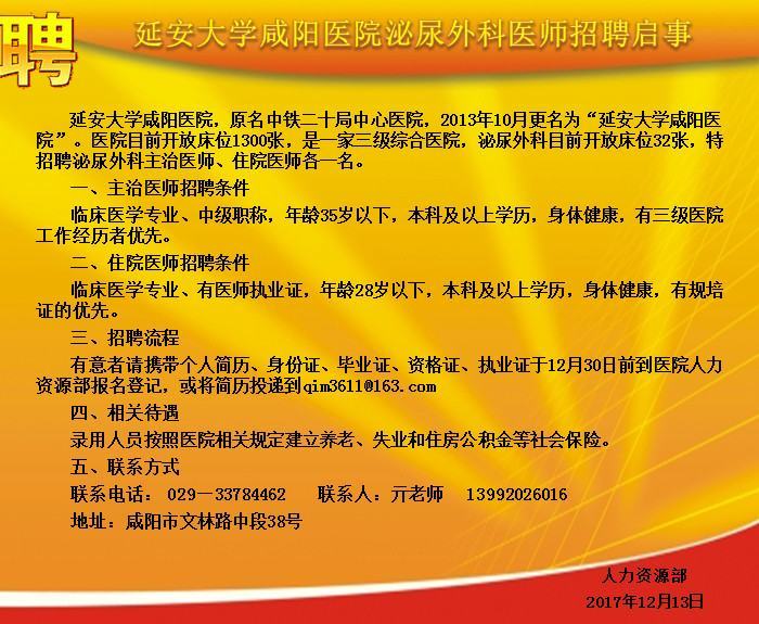 延安大學(xué)咸陽醫(yī)院泌尿外科醫(yī)師招聘啟事