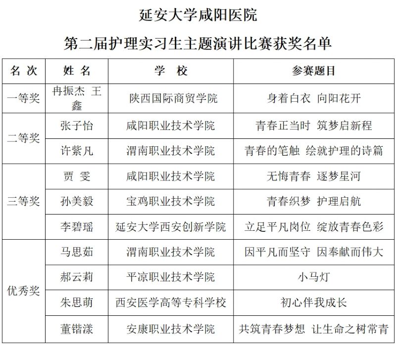 為弘揚(yáng)南丁格爾精神,樹立實(shí)習(xí)生對護(hù)理職業(yè)生涯的憧憬和認(rèn)知,理清成長脈絡(luò),立足本職工作,同時為實(shí)習(xí)生提供展示自我的平臺和鍛煉成長的機(jī)會,在這初冬時節(jié),我院護(hù)理教學(xué)管理委員會在腦血管病院第三學(xué)術(shù)廳成功舉辦以“青春、成長、筑夢、啟航 ”為主題的護(hù)理實(shí)習(xí)生演講比賽??蒲薪虒W(xué)管理中心副主任陳青、護(hù)理教學(xué)管理委員會主任委員黨文婷總護(hù)士長、全體教學(xué)管理委員會委員、教學(xué)組長以及全體實(shí)習(xí)生共200余人參加。本次活動由陜西國際商貿(mào)學(xué)院的王妞妞和安康職業(yè)技術(shù)學(xué)院的張家瑋同學(xué)主持,教學(xué)管理委員會部分委員及部分教學(xué)組長擔(dān)任評委。