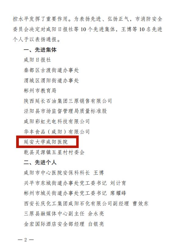 延安大學(xué)咸陽(yáng)醫(yī)院在全市消防安全工作考核評(píng)比過(guò)程中脫穎而出,被咸陽(yáng)市消防安全委員會(huì)授予“咸陽(yáng)市119消防先進(jìn)集體”榮譽(yù)表彰。