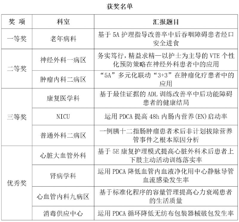經(jīng)過激烈的角逐和評(píng)委們公平公正的打分評(píng)判,本次護(hù)理質(zhì)量改善案例匯報(bào)活動(dòng)的獲獎(jiǎng)排名由質(zhì)量控制辦公室肖靜副主任宣讀。本次活動(dòng)評(píng)選出一等獎(jiǎng)1個(gè)、二等獎(jiǎng)2個(gè)、三等獎(jiǎng)3個(gè),優(yōu)秀獎(jiǎng)4個(gè)(獲獎(jiǎng)名單附后)。