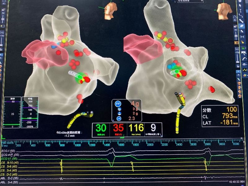 直立傾斜試驗明確診斷為血管迷走性暈厥(心臟抑制型),動態(tài)心電圖捕捉到長達2.023秒的RR間期,結(jié)合一度及二度I型房室傳導阻滯等特征,專家團隊判定患者存在顯著自主神經(jīng)功能紊亂。面對這一國際公認的診療難題,由吳棟梁教授、劉雄濤教授領銜的專家組果斷決策,采用國際前沿的心臟神經(jīng)節(jié)射頻消融術進行治療。
