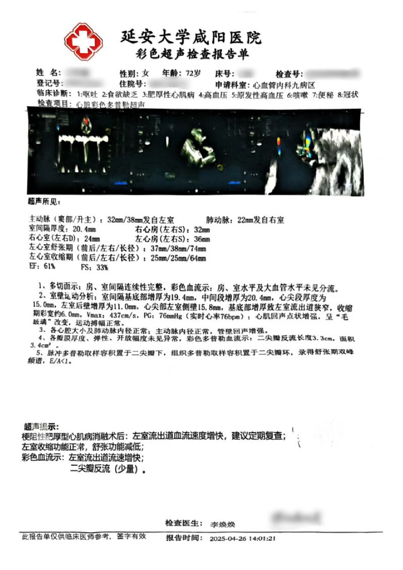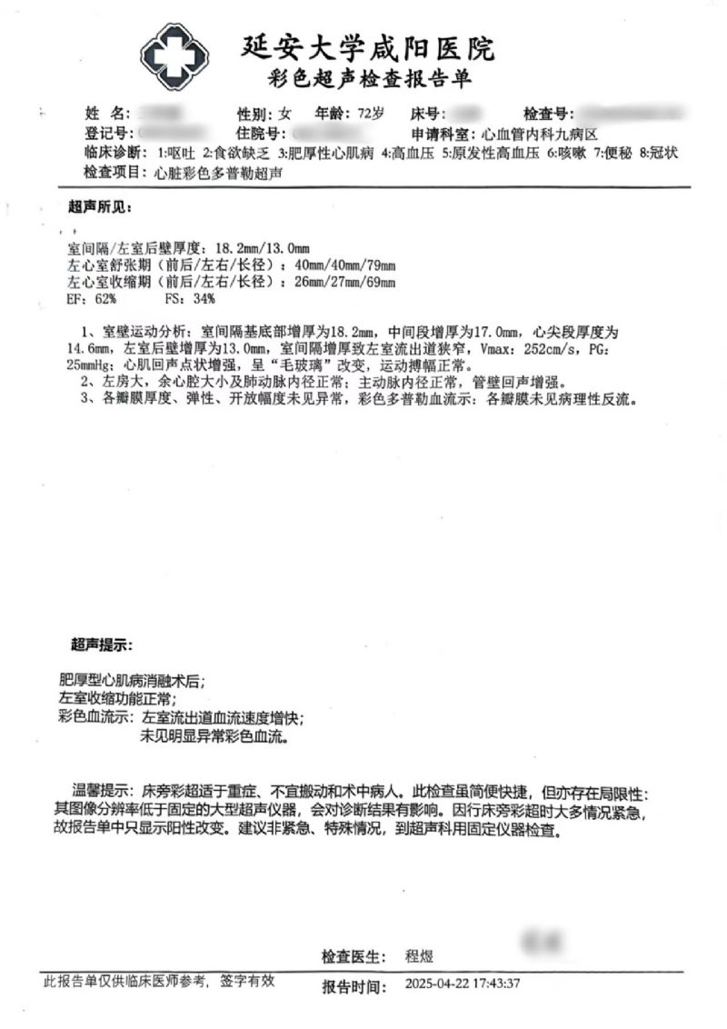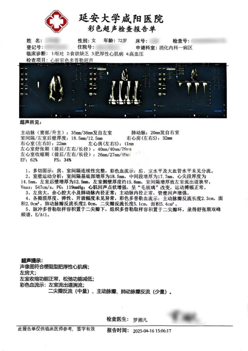 72歲的王女士(化名),早在7年前就被心臟彩超確診為室間隔肥厚并流出道梗阻。近期,她因“反復(fù)胸悶、氣短20余年,加重伴惡心、嘔吐1周”入住消化內(nèi)科。入院復(fù)查心臟彩超結(jié)果顯示:EF值為62%,F(xiàn)S值為34%;室間隔中上段厚度達(dá)到18.5/17.7毫米,左室流出道最大血流速度高達(dá)547cm/s,PG值為119mmHg,明確診斷為梗阻型肥厚型心肌病。同時(shí),腦鈉肽檢測(cè)值為3050.6ng/l。綜合評(píng)估后,王女士轉(zhuǎn)入心血管內(nèi)科九病區(qū)接受進(jìn)一步治療。
