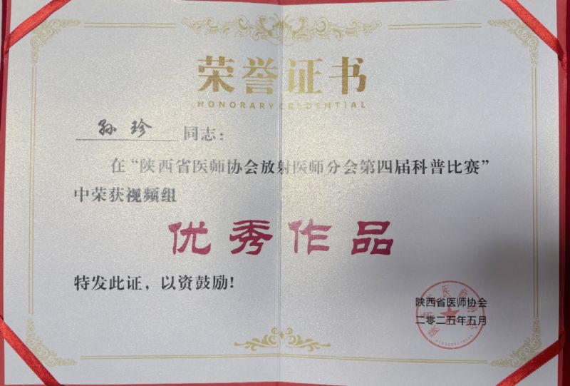 孫珍在科普比賽中獲得優(yōu)秀作品此次大賽成績(jī)的取得,既展現(xiàn)了我院醫(yī)學(xué)影像科CT/MRI室團(tuán)隊(duì)在省內(nèi)影像界的競(jìng)爭(zhēng)力,又展現(xiàn)了科室在醫(yī)教研全面發(fā)展方面取得的顯著成效,同時(shí)也擴(kuò)大了我院在省內(nèi)的知名度。