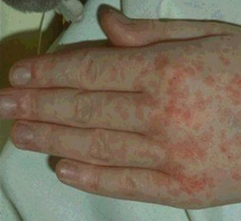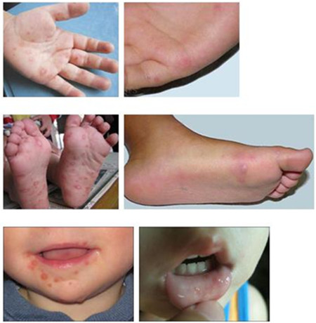 主要癥狀:先出現(xiàn)發(fā)燒癥狀,手心、腳心出現(xiàn)斑丘疹和皰疹(疹子周圍可發(fā)紅),口腔粘膜出現(xiàn)皰疹和/或潰瘍,疼痛明顯。部分患者可伴有咳嗽、流涕、食欲不振、惡心、嘔吐和頭疼等癥狀。少數(shù)患者病情較重,可并發(fā)腦炎、腦膜炎、心肌炎、肺炎等。