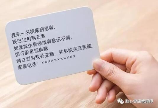 2、急救卡片:注明姓名、診斷、電話、用藥等。糖尿病急救卡片能夠提供重要的信息,使低血糖患者在最短的時間內得到診斷和治療。