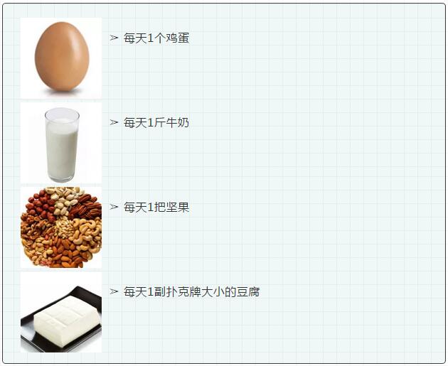宜:《中國居民膳食指南》(2016)建議每天喝一杯奶,或相當(dāng)于300g的液態(tài)奶制品;每天吃25-35g大豆及堅(jiān)果類,25g大豆相當(dāng)于365g豆?jié){的量。