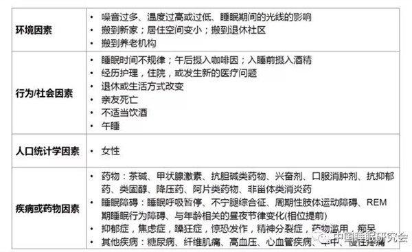 多種因素均會(huì)增加老年人發(fā)生失眠的風(fēng)險(xiǎn),包括環(huán)境、行為、疾病、人口統(tǒng)計(jì)學(xué)和社會(huì)因素等(詳見(jiàn)下表)。